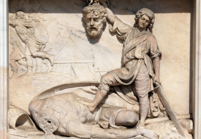 במקרא מסופר על הלוחם הפלישתי גוליית שהטיל מורא על בני ישראל. אל מולו קם להילחם דוד, רועה הצאן. גוליית מתואר כענק מאיים, בעל שריון נוצץ ונשקים אימתניים. דוד, לעומת זאת, מתואר כנער צעיר ועדין, ללא כל ניסיון בלחימה. שאול המלך, ואף גוליית עצמו, הזהירו את דוד כי אין לו שום סיכוי לעמוד מולו, וכי הוא צועד היישר אל מותו. בבגדי רועים, ובקלע פשוט ואבנים, ניצב הנער אל מול הענק החמוש. "וַיִּשְׁלַח דָּוִד אֶת יָדוֹ אֶל הַכֶּלִי וַיִּקַּח מִשָּׁם אֶבֶן וַיְקַלַּע וַיַּךְ אֶת הַפְּלִשְׁתִּי אֶל מִצְחוֹ וַתִּטְבַּע הָאֶבֶן בְּמִצְחוֹ וַיִּפֹּל עַל פָּנָיו אָרְצָה. נ וַיֶּחֱזַק דָּוִד מִן הַפְּלִשְׁתִּי בַּקֶּלַע וּבָאֶבֶן וַיַּךְ אֶת הַפְּלִשְׁתִּי וַיְמִיתֵהוּ וְחֶרֶב אֵין בְּיַד דָּוִד. נא וַיָּרָץ דָּוִד וַיַּעֲמֹד אֶל הַפְּלִשְׁתִּי וַיִּקַּח אֶת חַרְבּוֹ וַיִּשְׁלְפָהּ מִתַּעְרָהּ וַיְמֹתְתֵהוּ וַיִּכְרָת בָּהּ אֶת רֹאשׁוֹ וַיִּרְאוּ הַפְּלִשְׁתִּים כִּי מֵת גִּבּוֹרָם וַיָּנֻסו"ּ. (שמואל א', פרק י"ז)