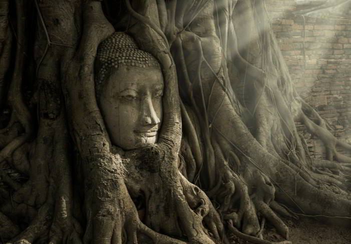 פניו של בודהה מגולפות בין שורשי עץ פיקוס מקודש