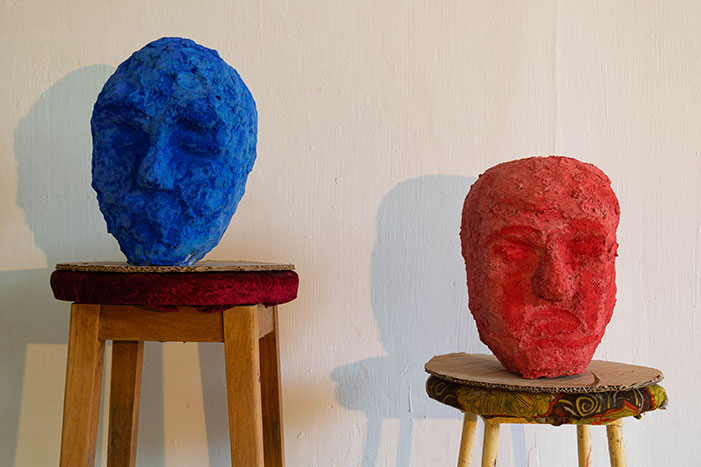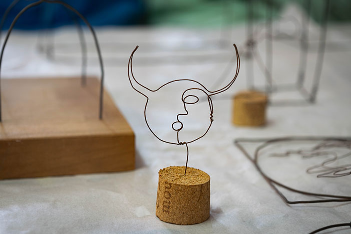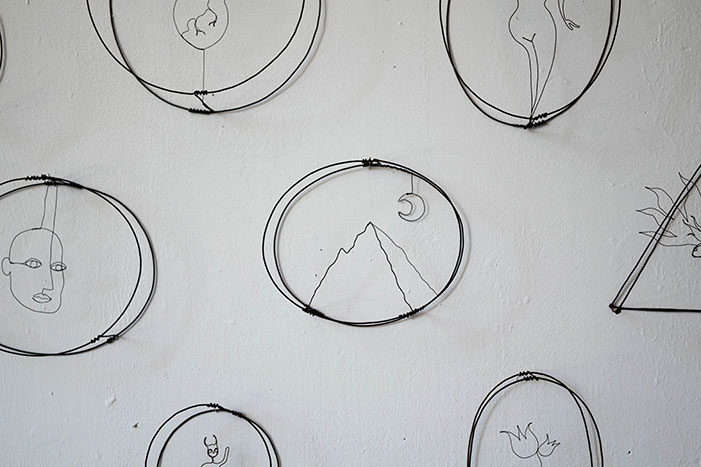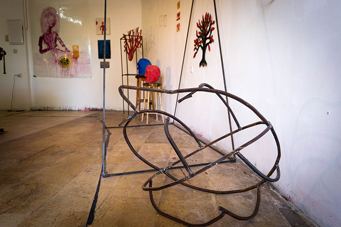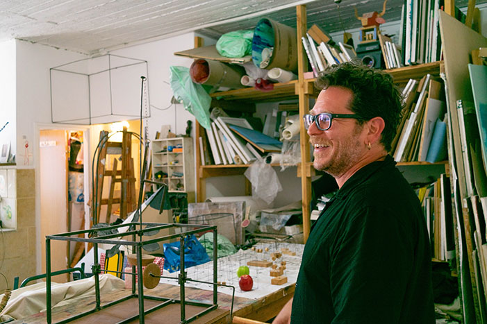 בשכונת תלפיות, מול מסעדת עמירה ומעל מאפיית לחם פיינגולד, שוכן חלל העבודה של איתי רון גלבוע. בנוף מסביב משתלבת האבן הירושלמית האצילית עם מבנים ישנים שיכלו להתברג בכל אזור תעשייתי בארץ, ולצידם בתי קרקע נמוכים, מצופים אבן טבעית בסגנון מזרחי, מעוטרים בפרגולות שופעות עלי גפן ירוקים. אחרי טיפוס בחדר מדרגות רחב ממדים אנחנו נכנסים פנימה. עשרות עבודות מיניאטוריות מחוטי ברזל ממלאות כל פינה, וכמה מיצבי ברזל גדולים תלויים מהקירות או ניצבים לידם. מכחולים גסים ומרופטים, פסלוני ברונזה קדומים ואבנים חומות מלאות טקסטורה מפוזרים בחדר. די מהר עולה תחושה מוכרת של סקרנות, כמו בדוכן עתיקות בשוק הפשפשים, שעושה חשק לפשפש ולגעת.