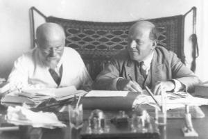 ביאליק ורבניצקי שוקדים על מפעל חייהם המשותף. צילום: צבי אורון, מתוך ארכיון הרווארד.